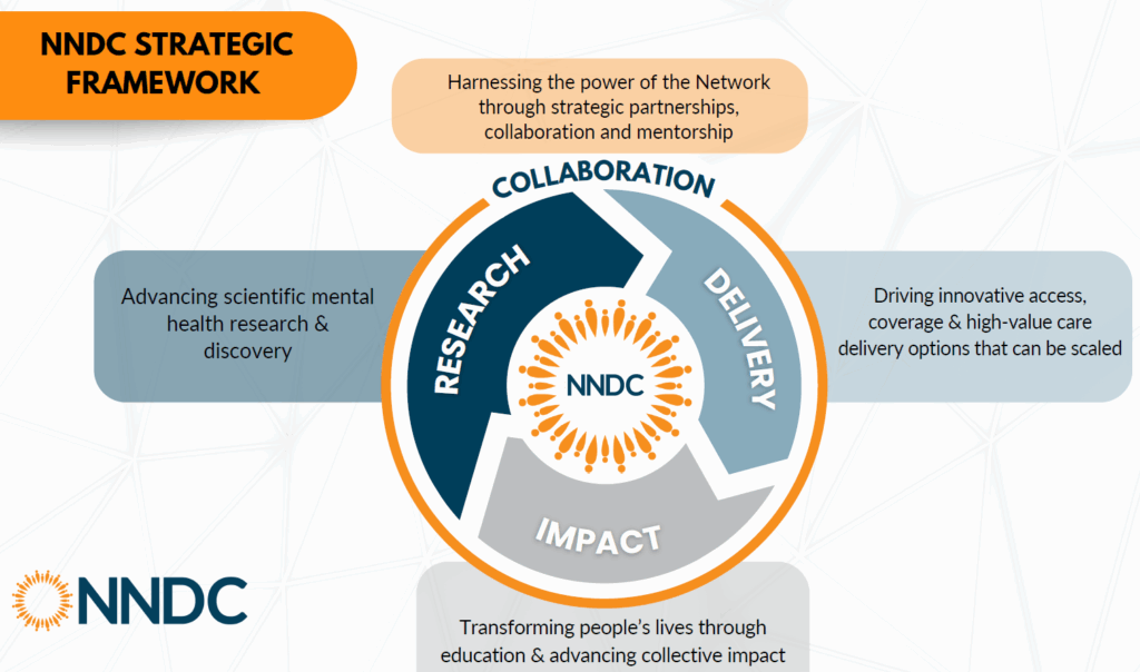 The National Network of Depression Centers (NNDC) collaborates with members to use the power of the network to transform lives through research and innovations in treatment and prevention of depression and bipolar disorders to create a world free of stigma where everyone has access to effective, evidence-based care.